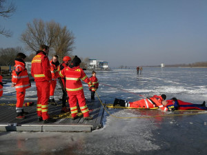 Gut gesichert hat sich eine Rettungsschwimmerin im Neoprenanzug ins kalte Wasser begeben. Mit verschiedenen Hilfsmitteln und mit Leinen gesicherten Personen wurde diese von den Helfern gerettet. So zum Beispiel wurde Sie rücklings aus dem Eisloch und mit Hilfe eines Spineboards von den Helfern an Land gezogen. Auf einer Vakuummatratze wurde die Verunglückte auf eine Trage gehoben. Mit Rettungsdecken eingewickelt ging es dann zum Krankenwagen.